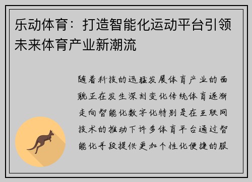 随着科技的迅猛发展,体育产业的面貌正在发生深刻变化。传统体育逐渐走向智能化、数字化,特别是在互联网技术的推动下,许多体育平台通过智能化手段提供更加个性化、便捷的服务。乐动体育作为行业中的创新者,致力于打造一个智能化运动平台,旨在通过高科技手段提升运动员的表现,优化用户体验,并推动整个体育产业的升级转型。本文将从四个方面详细探讨乐动体育如何通过智能化平台引领未来体育产业的新潮流:智能化平台的构建、数据分析与个性化推荐、运动员和用户体验的提升、以及体育产业未来的智能化趋势。通过这些探讨,本文将全面分析乐动体育在行业中的独特优势及其推动体育产业革新的作用。