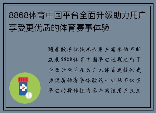 随着数字化技术和用户需求的不断发展,8868体育中国平台近期进行了全面升级,旨在为广大体育迷提供更为优质的赛事体验。这一升级不仅在平台的操作性、内容丰富性、用户交互性等方面进行了优化,更致力于通过技术手段、智能化服务等提升用户的整体观赛体验。本文将从四个关键方面详细探讨8868体育中国平台如何通过这次全面升级,帮助用户享受更加流畅、丰富和精准的体育赛事体验。