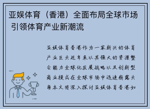 亚娱体育(香港)作为一家新兴的体育产业巨头,近年来以其强大的资源整合能力、全球化发展战略以及创新型商业模式,在全球市场中迅速崭露头角。本文将深入探讨亚娱体育(香港)如何通过全面布局全球市场,逐步引领体育产业的新潮流。从其全球战略布局、技术创新、合作伙伴关系的拓展以及在体育产业数字化转型中的独特优势四个方面入手,详细阐述亚娱体育(香港)如何在竞争激烈的全球体育市场中占据一席之地,成为行业的领导者。最终,文章将总结亚娱体育(香港)在全球市场布局中的成功经验,分析其为体育产业带来的深远影响,并展望未来体育产业的新趋势。